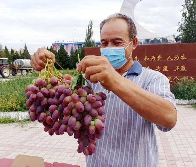 8月13日上午,伊力特釀酒四廠員工阿布地克依木•阿不力米提提著一大串飽滿鮮亮的紅提葡萄,放一顆在嘴里,邊吃邊招呼同事。