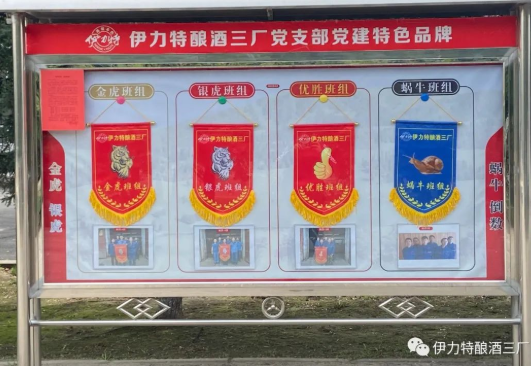 2022年4月7日,伊力特公司釀酒三廠黨支部召開 “金虎銀虎·蝸牛倒數”黨建特色品牌創建活動首次表彰會議,黨支部書記楊奎、廠長賴良、副廠長劉勇現場為金虎班、銀虎班、優勝班等獲獎班組授旗頒獎。